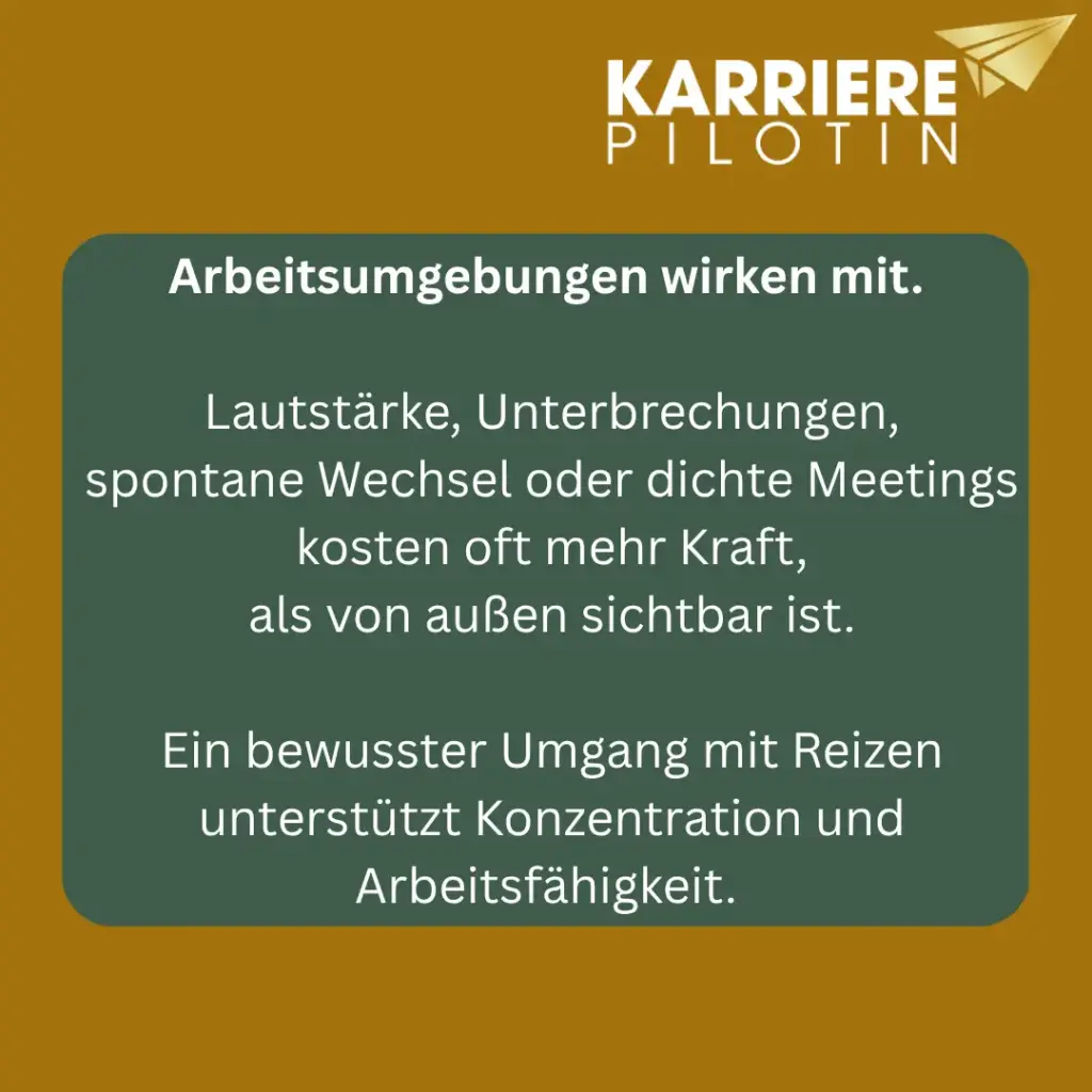 Hinzu kommt das Reizumfeld. Lautstärke, Unterbrechungen, spontane Wechsel, dichte Meetings oder unklare Prioritäten kosten im Arbeitsalltag oft mehr Kraft, als von außen sichtbar ist. Gerade für Menschen, die Reize intensiver verarbeiten oder viel Energie für Anpassung und Sortierung aufwenden, kann dieser Punkt entscheidend sein. Ein bewusster Umgang mit Reizen bedeutet nicht, dass Arbeitsrealität weichgespült werden muss. Es bedeutet vielmehr, Arbeitsfähigkeit ernst zu nehmen. Schon kleine Veränderungen können viel bewirken: besser planbare Abläufe, ruhigere Arbeitsphasen, klarere Übergaben, vorbereitete Besprechungen oder eine verständliche Reihenfolge von Aufgaben.