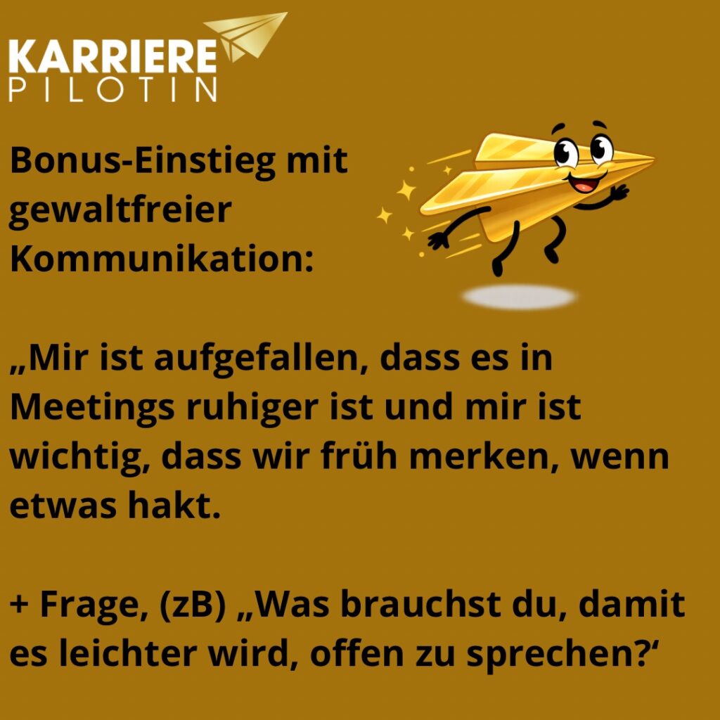 Wenn Stille im Team zunimmt, lohnt sich ein früher, ruhiger Einstieg. Hilfreich ist eine Beobachtung ohne Bewertung, zum Beispiel: Mir ist aufgefallen, dass es in Meetings ruhiger ist, und mir ist wichtig, dass wir früh merken, wenn etwas hakt. Danach wirkt eine kleine, konkrete Frage oft stärker als ein großer Problemaufruf. Genau dort beginnt gute Führungskommunikation. Sie macht Gespräche wieder möglich, stärkt psychologische Sicherheit im Team und schützt Mitarbeiterbindung oft wirksamer, als es von außen zunächst aussieht.